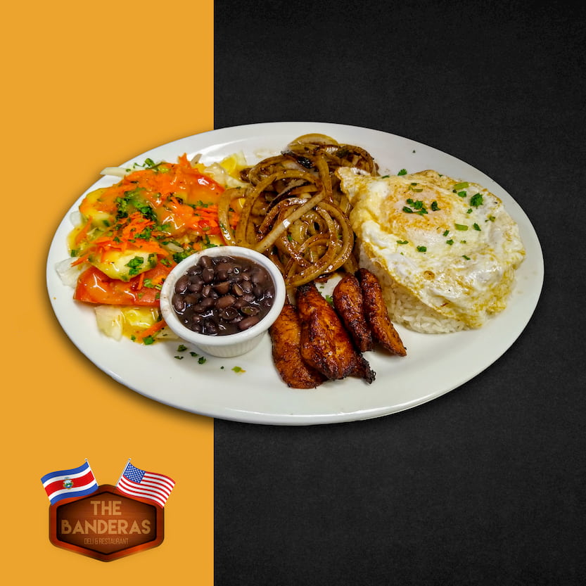Arroz, frijoles, carne asada,maduro, huevo y ensalada/ Rice, beans, steak, sweet plantain, egg and salad
