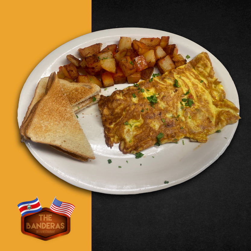 Torta de huevo con cebolla, chile dulce y jamón. Servido con papas de la casa y tostadas. / Western Omelette