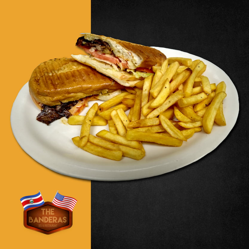 Sándwich en pan largo hecho con Carne, lechuga,tomate y cebolla con salsa rosada y al mejor estilo panini. Servido con Papas chips o papas fritas / Beef, lettuce, tomato, and onions