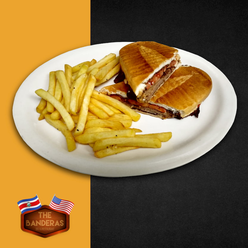 Sándwich en pan largo hecho con Carne, frijol molido,queso y tomate,con salsa rosada y al mejor estilo panini. Servido con Papas chips o papas fritas / Crushed beans,beef,cheese, tomato